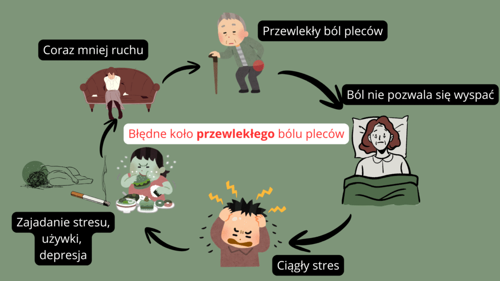 Jeśli rwa kulszowa nie ustępuje, ból utrzymuje się przez wiele miesięcy (rok i dłużej), warto spojrzeć na problem szerzej, ponieważ najczęściej ma on inne podłoże niż tylko stan zapalny opisany wyżej. Przewlekły stres, brak snu i regeneracji, palenie papierosów, nieprawidłowa dieta czy siedzący tryb życia potrafią same w sobie być przyczyną dolegliwości bólowych odcinka lędźwiowego. Co więcej, wszystkie te czynniki napędzają się wzajemnie, tworząc błędne koło przewlekłego bólu pleców (grafika poniżej).